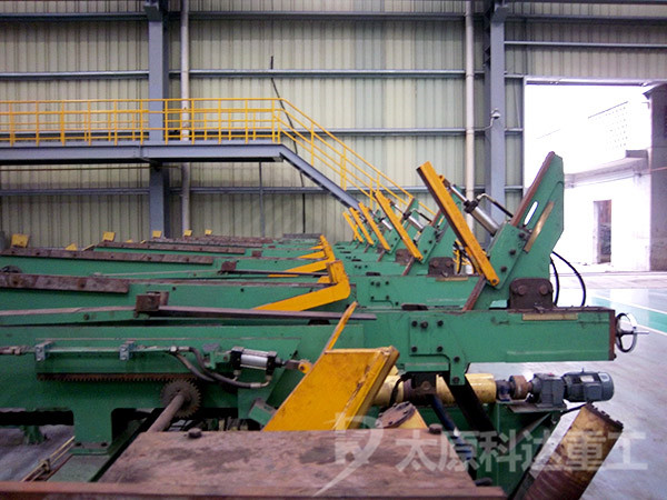 鋼管在前序的生產(chǎn)線(xiàn)上完成所有的工序后到達(dá)自動(dòng)堆垛機(jī)前的對(duì)齊輥道上,經(jīng)過(guò)頭部對(duì)齊的鋼管的由連續(xù)提升機(jī)構(gòu)提升到計(jì)數(shù)臺(tái)架上,由于臺(tái)架是與水平面成一定角度的斜面,當(dāng)鋼管******次自由下滾,遇到升降擋塊后停止運(yùn)動(dòng),與此同時(shí)計(jì)數(shù)傳感器對(duì)鋼管進(jìn)行計(jì)數(shù),當(dāng)鋼管數(shù)量達(dá)到******層根數(shù)后,計(jì)數(shù)傳感器發(fā)出信號(hào),與液壓缸相連的升降擋塊下降,鋼管成排的橫移到鋼管成排上料位,完成鋼管的成排橫移,此時(shí)鏟板升降機(jī)構(gòu)升起將鋼管成排的抬起,此時(shí)電動(dòng)機(jī)啟動(dòng),由鏈輪、鏈條來(lái)帶動(dòng)鏟板輸送小車(chē)向前,當(dāng)鋼管到達(dá)堆垛收集成型模具的正上方時(shí)停下來(lái),鏟板升降機(jī)構(gòu)下降,然后鏟板輸送小車(chē)返回,將鋼管成排的放入堆垛收集成型模具中,此時(shí),堆垛收集成型模具自動(dòng)向下向下移動(dòng)一個(gè)管徑,完成******層鋼管的堆垛,依次循環(huán)多次,直到鋼管全部堆垛成型后運(yùn)走打包。